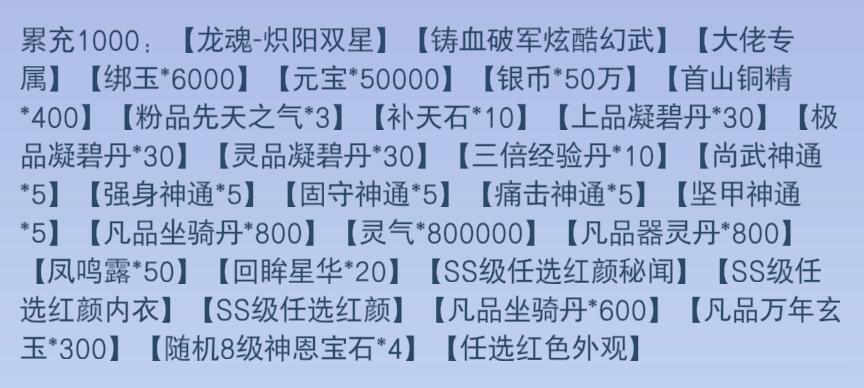 伏龙精魂*1、寻宝图*20、元宝*3000、绑定仙玉*300